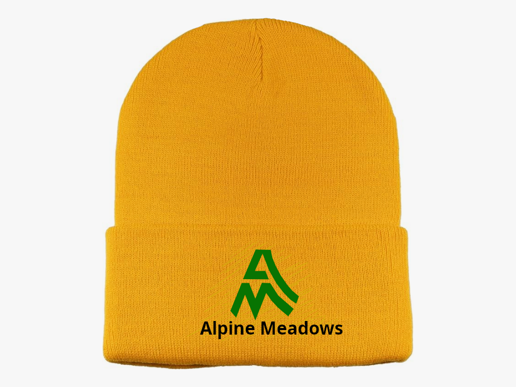 Golden-yellow beanie with dark green Alpine Meadows logo. Says "Alpine Meadows" in black under the logo. Yellow stitches to give it stability and make the logo really pop. We hope that you enjoy this limited edition collector's beanie!