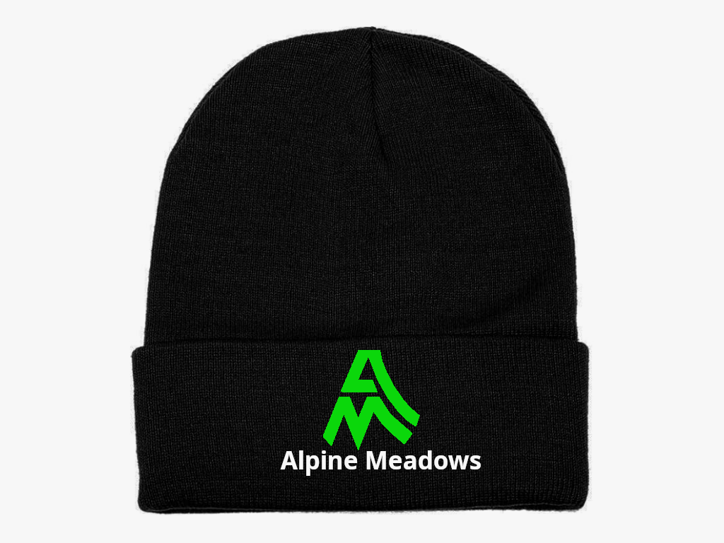 This beautifully hand-crafted beanie is available for a limited time only. Black beanie with bright green Alpine Meadows logo and white text.