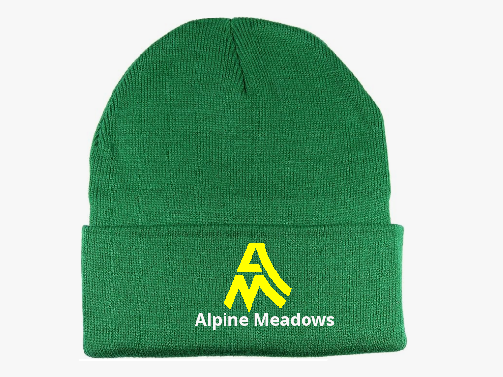 This light green beanie features yellow Alpine Meadows logo and white text. Limited edition artist rendering. Handmade with machine assistance right here in our studio!