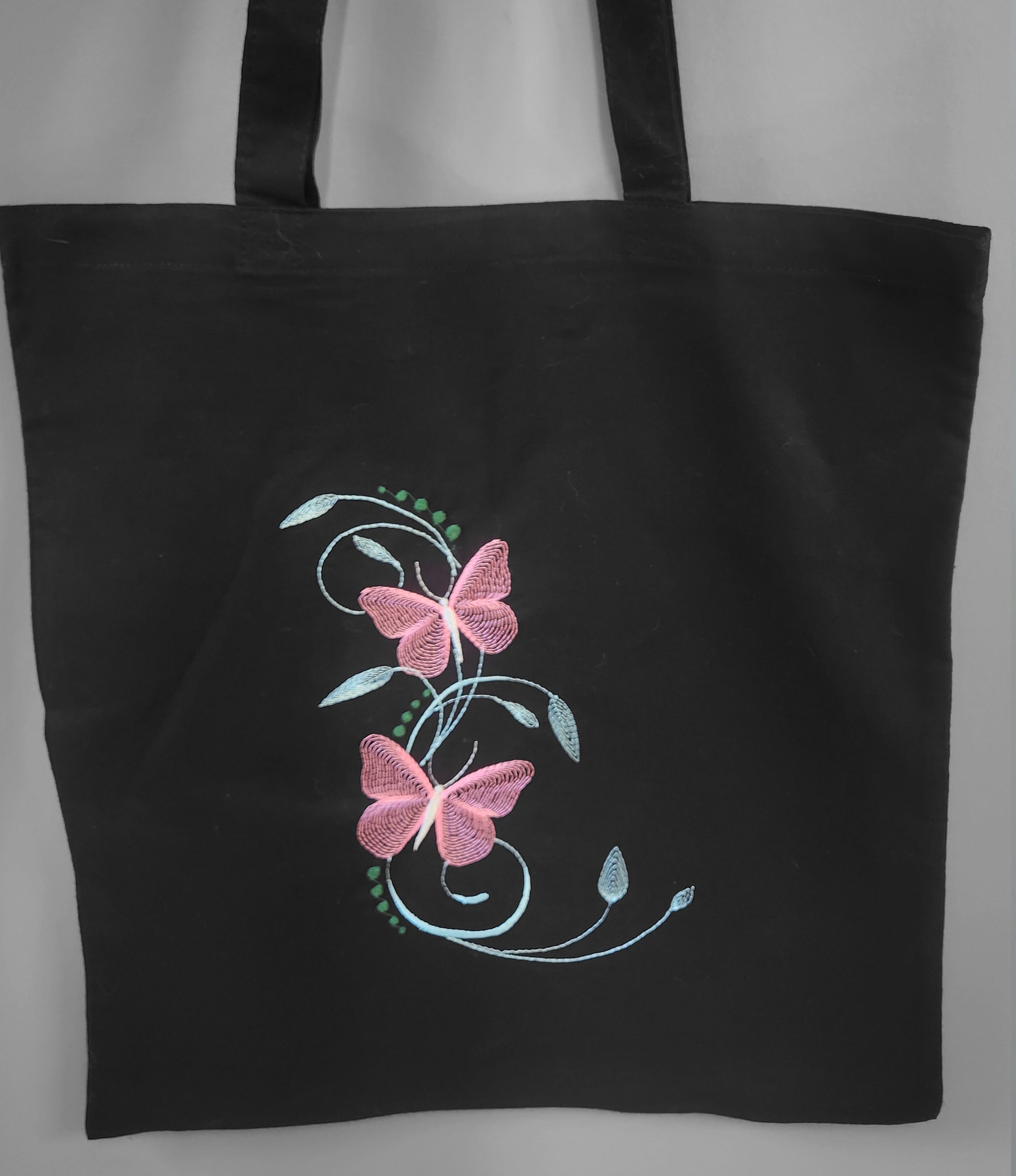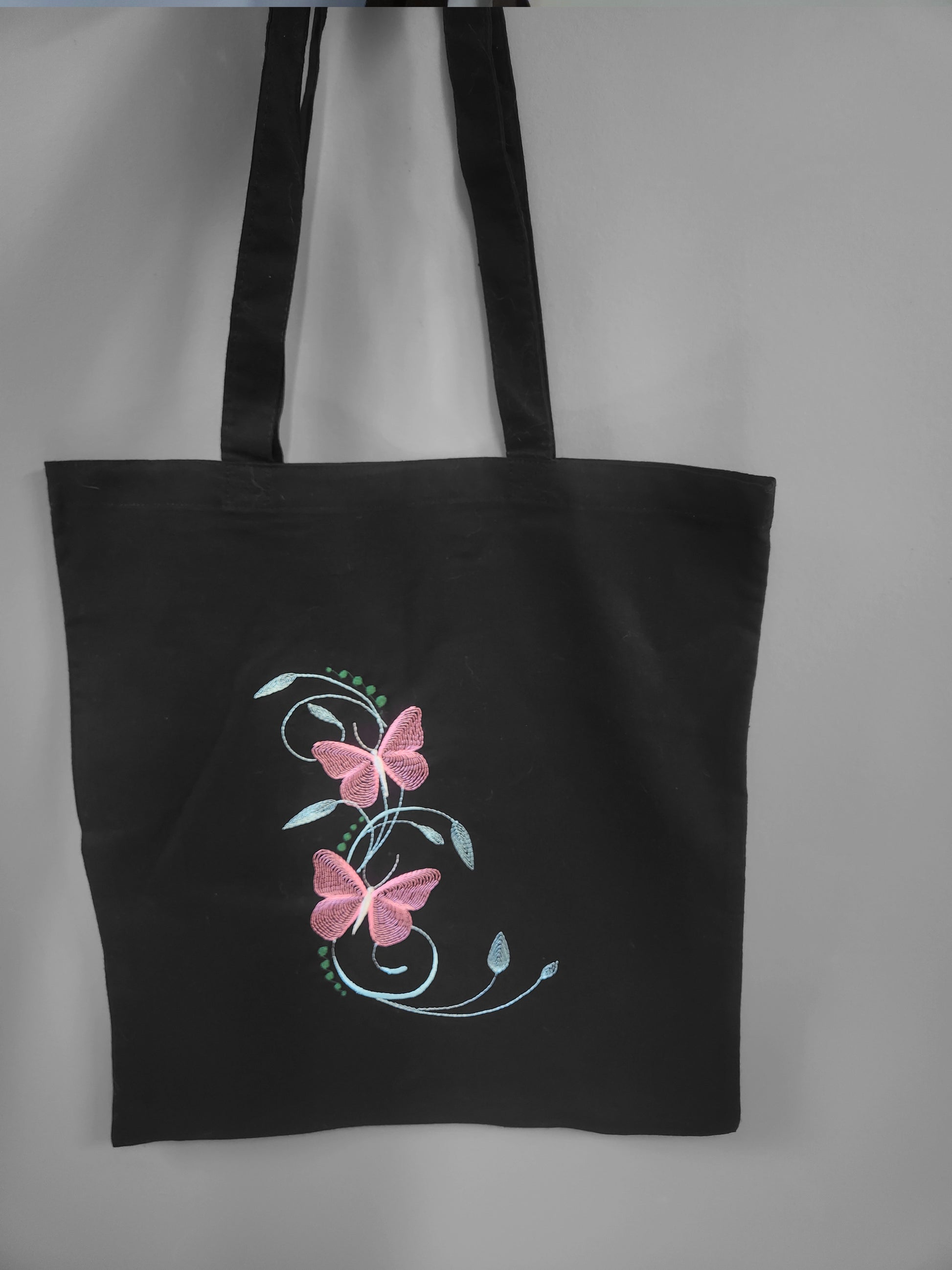 Celebrate spring with our dual butterflies swirl bag. Every bag is hand embroidered with machine assistance and is a perfect blend of style, sustainability, and social good. Crafted with love by our woman-owned business, each tote is made from 100% organic cotton in a low-waste process.