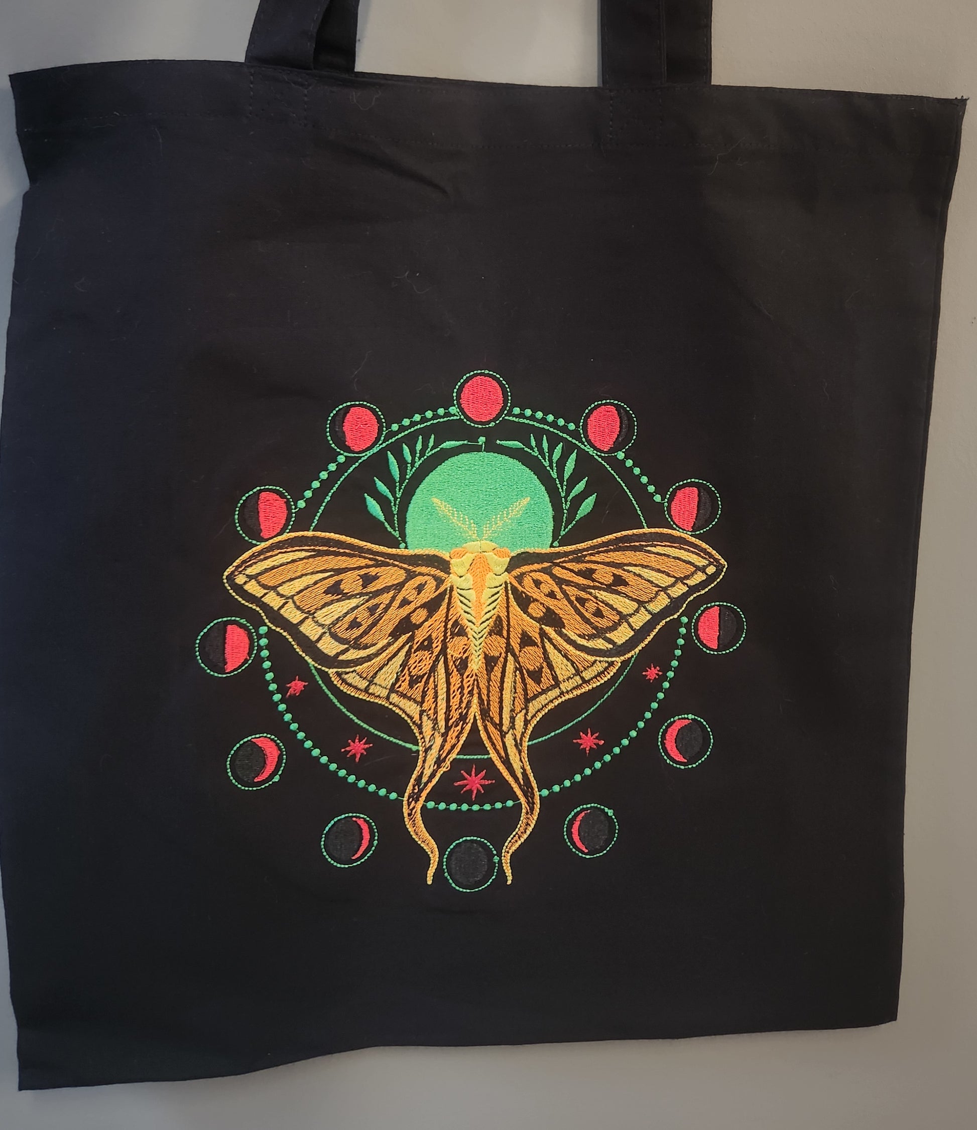 Celebrate spring with our Moth Moon Cycle tote bag. Every bag is hand embroidered with machine assistance and is a perfect blend of style, sustainability, and social good. Crafted with love by our woman-owned business, each tote is made from 100% organic cotton in a low-waste process.